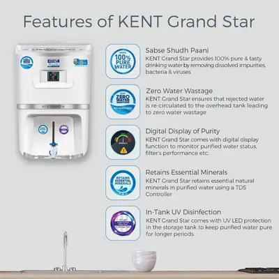 Brand KENT Special Feature UV, RO Product Dimensions 15.8L x 9.1W x 21.3H Centimeters Package Information Dispenser Power Source Corded Electric Material Plastic Capacity 9 litres Included Components Pipe : 2N Connector : 1N Valve: 1N Warranty card: 1NPipe : 2N Connector : 1N Valve: 1N Warranty card: 1N See more Purification Method Reverse Osmosis About this item The multistage purification process makes water 100 percent pure and safe for consumption The smart RO purifier has a digital display of purity for the convenience of the users, the digital display feature informs the users about the filter life, RO flow rate, and purified water quality Kent grand star is India's first RO water purifier with an in-tank uv disinfection feature, this ensures that the water in the storage tank is purified and safe for consumption The water purifier has a high storage capacity which ensures continuous supply of water even in the absence of electricity Conventional RO purifiers reject almost 80 percent of the water and retain only 20 percent as purified ...Read More